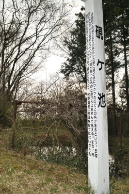 硯ヶ池は源義経が姉歯の松で小休止した際硯の水に使ったのでこの名がある 高台にあるが水は枯れた事がない |
