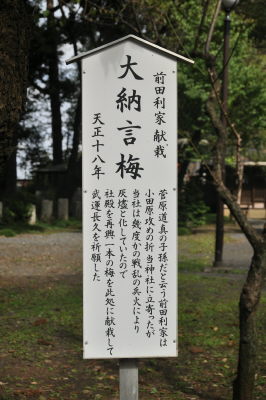 | 上左端 白旗塚 新田 義貞がここに陣をはり源氏のシンボルの白い旗をかかげた伝承が残る場所 上中左 板東第一北野天神社 所沢市小手指元町3-27-28 上中右 後醍醐天皇第三皇子宗良親王遺跡と歌碑 天神社境内 君のため 世のため何か おしからむ 捨てて甲斐ある 命なりせば 南朝の戦う親王は新田義貞等と白旗塚に陣を張り北朝足利鎌倉軍と小手指ヶ原合戦で指揮を執った その時陣の士気をを鼓舞した歌 又境内には所沢出身の俳優左 木全の碑もある 常道の芸では先が知れてる されば逆遠き苦難の道を求めん 上右端 前田利家献栽の梅 大納言梅 境内 頼義 義家・頼朝・尊氏等板東武士の信仰熱いこの神社に菅原道真の末裔という前田利家が秀吉の小田原攻めの際に立ち寄り梅を植えた伝説がある |