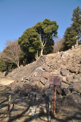 | 一夜城の現在の石垣 当時は 石工(いしく)の穴太(あのう)衆による野面積みされていた石垣 穴太衆は織豊時代に活躍した滋賀県比叡山禄にある穴太の里 寺社・城郭の石組みに高い技術を持つ石工集団 滋賀県大津市坂本穴太と言う地名がある 右端には石垣に使われずに残された石の一部 |