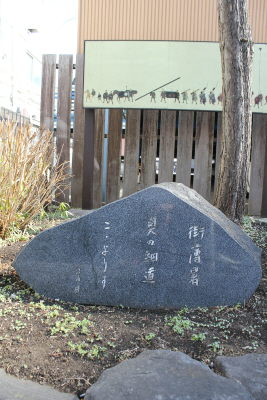 | 右端 芭蕉句碑 鮎の子の 白魚送る 別哉 この句は『行く春や・・・』の句の前に創作されたが奥の細道の千住の文体には合わないと不採用になった句 千住宿歴史プチテラス前 |