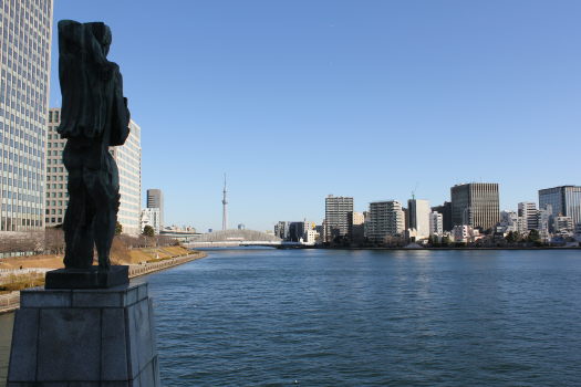 左 新川之跡からの隅田川と佃島のタワーマンション群 右 中央大橋のメッセンジャーの碑 中央区新川2-32-4 上流永大橋とスカイツリーを見る 隅田川とセーヌ川を繋ぐ友好を記念してパリ市(シャーク・シラク)から東京都へオシップ・ザッキン『「メッセンジャー像』が寄贈された