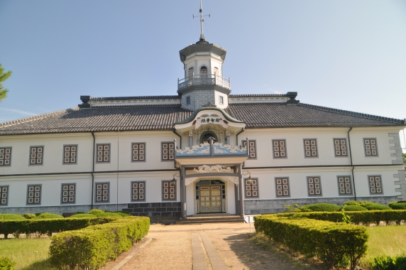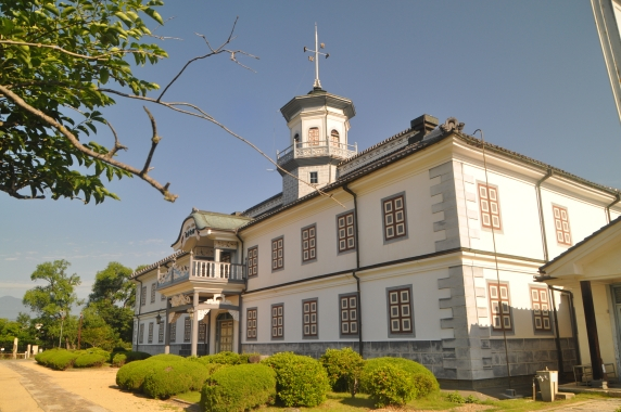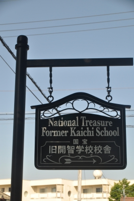 上 国宝 旧開智学校 松本市開智2-4-12 1961年国指定重要文化財 2019年国宝指定される 地元の大工棟梁立石清重が明治9年に完成させた擬洋風建築という特殊な様式で文明開化を象徴する代表的建物 注目は正面の車寄せ 八角形の太鼓楼と下の寺にあるような破風屋根のアーチと2人の天使が開智学校のプレートを持ちその下のバルコニーには雲の彫刻があり一番下に青龍の彫刻がある 田舎の大工の近代化を意識した精一杯の和洋建築だったのだろう. |