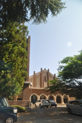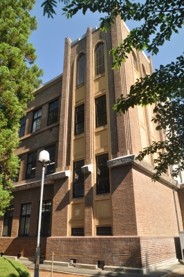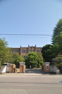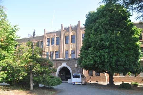 国指定登録有形文化財 松本深志高等学校 松本市蟻が崎3-8-1 長野県最古の高等学校 明治8年(1876)創立 管理普通教室棟と講堂が文化財指定を受けている 旧制松本中学として昭和18年に建築され県内における.初期鉄筋コンクリート3階建てスクラッチタイル張り・正面中央玄関ポーチの緩やかな尖頭アーチ・2~3階通しの先を尖らせた柱型などゴシック風意匠に特徴を持つ 東京帝国大学安田講堂が手本と伝える |