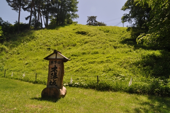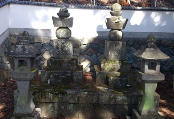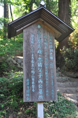 左 広沢寺参道 中 松本市特別史跡 元和元年(1615)大坂夏の陣にて戦死 松本城主 小笠原秀政・忠脩両公墓地 御霊屋へここより右200m登る とある 右 秀政(右)・忠脩(左)墓碑 |