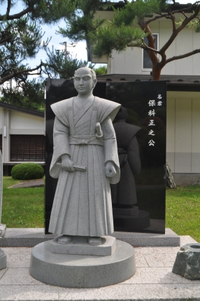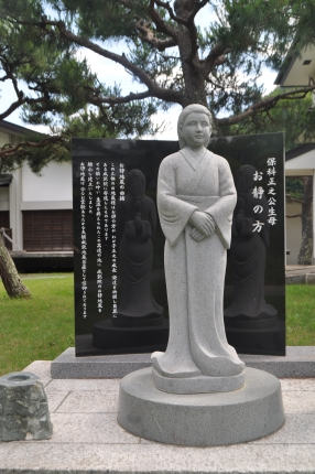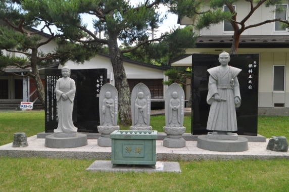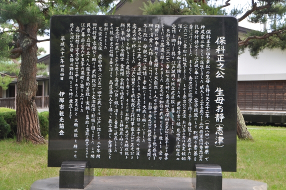 | 左 保科正之・生母お静と三体地蔵の碑 高遠町歴博物館敷地内 伊那市高遠町東高遠457 真ん中の地蔵は金剛宝・金剛憧・金剛願の三体で正之の大願成就を願い生母お静が江戸目黒にある成就院に奉納した同一のものものを縮小し建立したもの お静は2代将軍秀忠の乳母付き侍女として江戸城に奉公していたが堅物秀忠がお静とたった一度の浮気をしてできたのが正之だ だが正室お江(信長の妹お市の方の三女)は嫉妬深くその悋気を恐れてた周りの者がそっと高遠城の保科正光公の養子に出したので母子ともに高遠に居住した 7歳から26歳まで高遠におりその後最上藩から会津藩藩主となり名君として会津の基礎をつくりさらに異母兄3代将軍家光を支え徳川幕府の土台を築いた | |