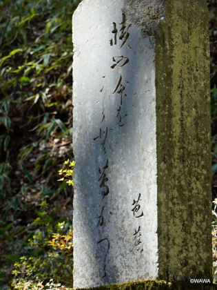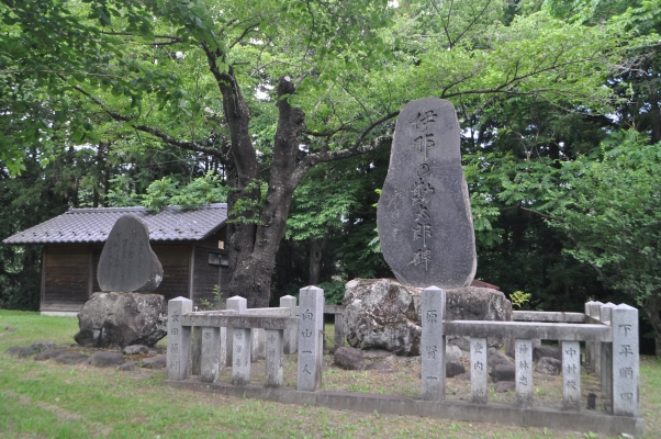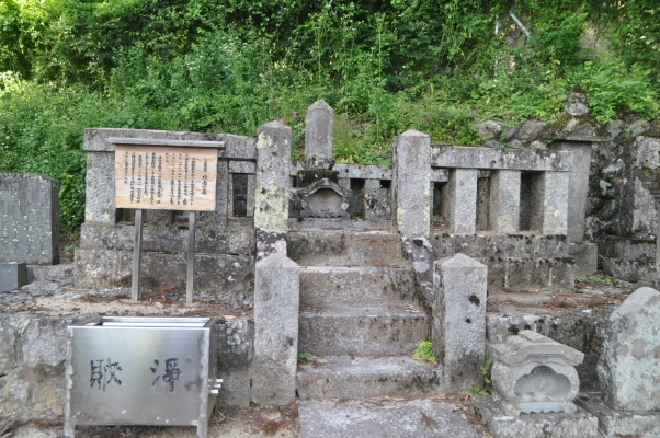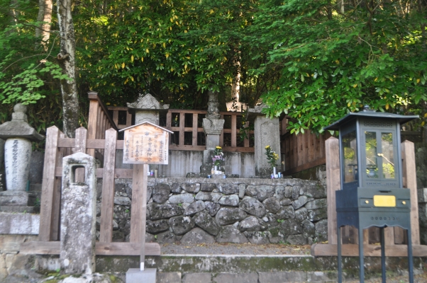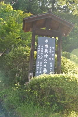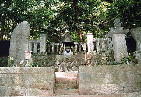 | 左端 種田山頭火句碑 さくらちり 終えたるところ 旭将軍の墓 後ろに巴の松が見える 中 木曽義仲公の墓碑入口 右端 木曽義仲公墓碑 中央義仲公・左18代義康・右12代道信公 木曽義仲最後の言葉 日来はなにともおぼえぬ鎧が、今日は重ふなったるぞや 所々で討たれんより一所でこそ討死もせめ | |