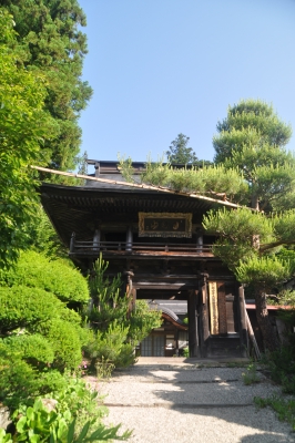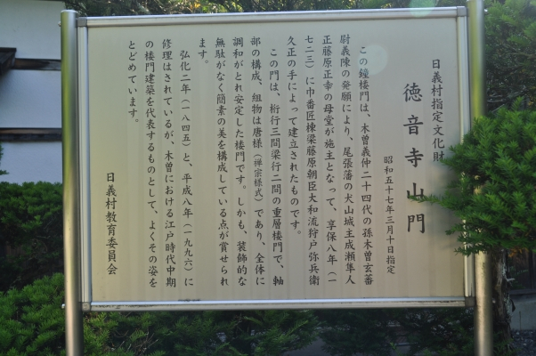 | 左 日義村指定文化財 日照山徳音寺山門 木曽郡木曽町日義124-1 馬上の巴御前の像のあるこの寺の山門は木曽義仲24代の孫木曽義陳の発願により享保8年(1723)に建立されたもの云々・・・ と説明板にる 中 徳音寺山門 右 日照山徳音寺 | |