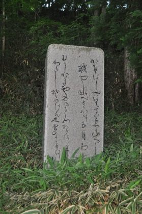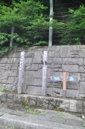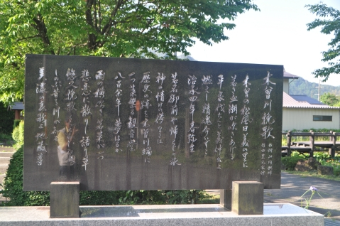 | 左端 御嶽登山道 中左 正岡子規句碑と歌碑 かけはしや あぶない処に 山つつじ・梯や 水にととかず 五月雨・むかしたれ 雲のゆききの あとつけて わたしそめけん 木曽のかけはし 中右 芭蕉句碑 かけはしや 命をからむ 蔦かづら 右端 梯は向かい側から見てください とある | |