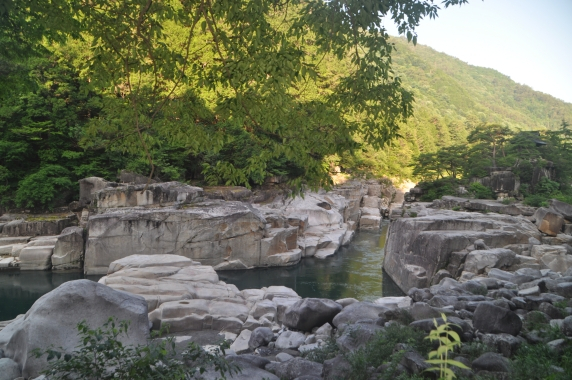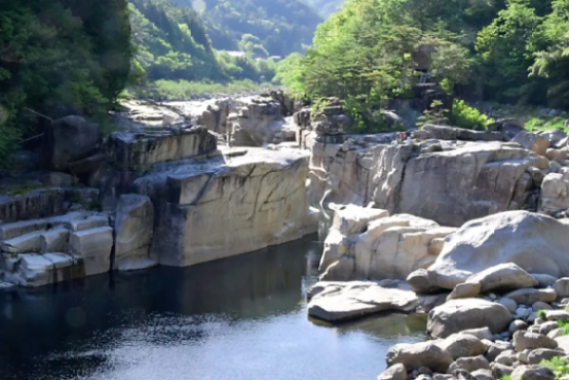 | 上6点 寝覚ノ床の花崗岩群 人の姿からして水面からの高さが20m以上ありそう花崗岩群 天下の絶景なので尾張藩主や日光例幣使・参勤交代の大名・文人墨客・一般旅人はここで宿泊・小休止をした |