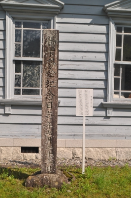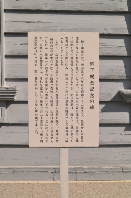 | 左 御下賜金紀念日毎年七月二十五日 (記ではなく紀となっている) 中 御下賜金記念の碑 宮内庁から毎年.一万円を村内住民に支払う事情説明板 御下賜金とは明治38年から昭和22年まで皇室から木曽谷住民に与えられたお金のこと 明治政府が強制的に木曽谷一帯を官有林に指定して皇室財産としたため生活の糧を回復するため島崎藤村の兄広助が反対運動を起こしたが山林は戻らずやむを得ず上述の結果となった 右 森林鉄道の機関車 この機関車は南木曽町の国有林で運転されていたもの この森林鉄道の総延長は69kmもあった 昭和2年から昭和42年まで40年にわたり国有林の木曽檜や木材のみならず生活物資を運んだり住民の足として利用され山村地域の生活に密着していた 福沢桃介記念館の隣にある |