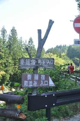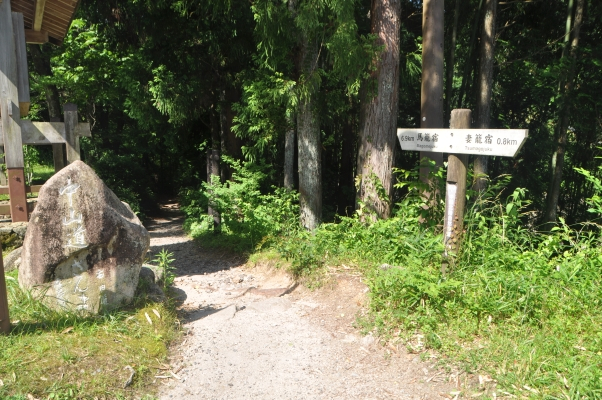 | 左 中山道妻籠宿 木曽郡南木曽町吾妻 中 旧中山道と中山道碑 右 妻籠宿街並み入口案内板 |