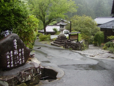 | 左2点 雨の馬籠宿 20年前の画像 右端 是より北木曽路の碑 |