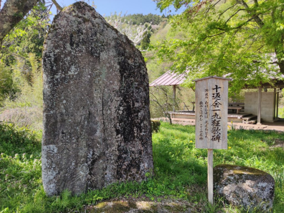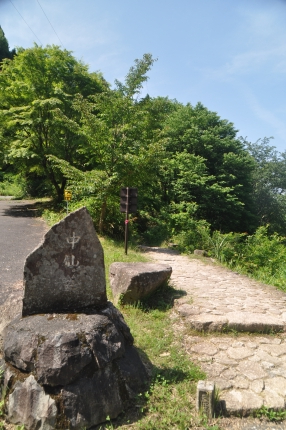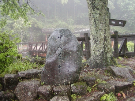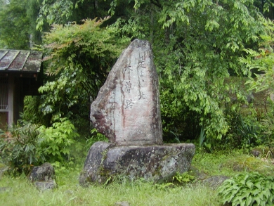 | 右端 十辺舎一九狂歌碑(ネットより拝借) 古くから峠の名物であった粟のこわ飯を文政2年戯作者十辺舎一九が木曽路を旅して馬籠の宿で『木曽街道膝栗毛』の中で 渋皮の むけし女は 見えねども 粟のこわめし ここの名物 の狂歌を詠んだ とある 右2点 峠の集落跡にある中仙道碑 岐阜県中津川市馬籠 |