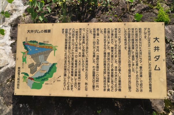 左 大井ダム・大井発電所完成記念 福沢諭吉レリーフと座右の銘 独立自尊の文字 中 大井ダム建設由緒書板 右 恵那湖畔の福沢桃介像と人生のよきパートナーの川上貞奴の顔のレリーフ ![]()