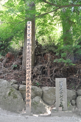 左端 大明山龍護寺(明智遠山氏代々の墓地がある) 明智光秀公御霊廟の寺 恵那市明智町1389 中左 明智光秀公の16文字の長い戒名と光秀公出生の地碑 中右 明智光秀公御霊 龍護寺境内 尚ここの明智遠山家の分家から江戸時代の名奉行遠山の金さんが出てる 右端 明智駅 ![]()