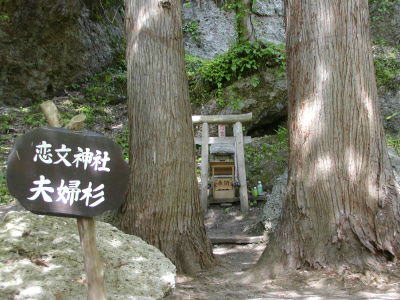 秋田県立自然公園内きみまち阪第一広場内の娚杉の大木の間にある小さな祠